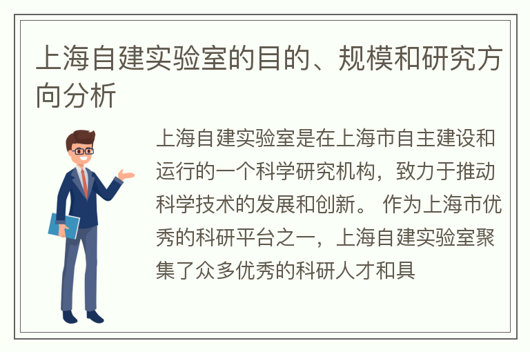 上海自建实验室是在上海市自主建设和运行的一个科学研究机构,致力于推动科学技术的发展和创新。 作为上海市优秀的科研平台之一,上海自建实验室聚集了众多优秀的科研人才和具......【点击详情】