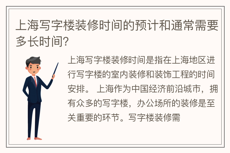 上海写字楼装修时间是指在上海地区进行写字楼的室内装修和装饰工程的时间安排。 上海作为中国经济前沿城市,拥有众多的写字楼,办公场所的装修是至关重要的环节。写字楼装修需......【点击详情】