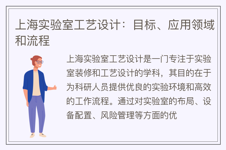 上海实验室工艺设计是一门专注于实验室装修和工艺设计的学科,其目的在于为科研人员提供优良的实验环境和高效的工作流程。通过对实验室的布局、设备配置、风险管理等方面的优......【点击详情】