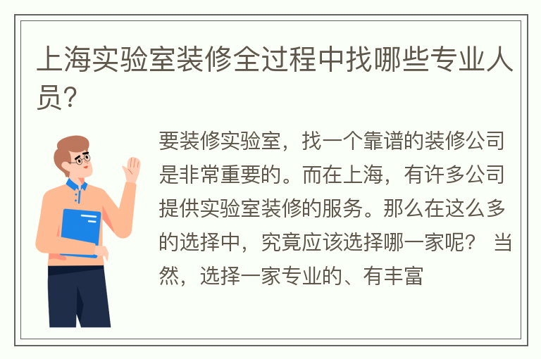 要装修实验室,找一个靠谱的装修公司是非常重要的。而在上海,有许多公司提供实验室装修的服务。那么在这么多的选择中,究竟应该选择哪一家呢? 当然,选择一家专业的、有丰富......【点击详情】