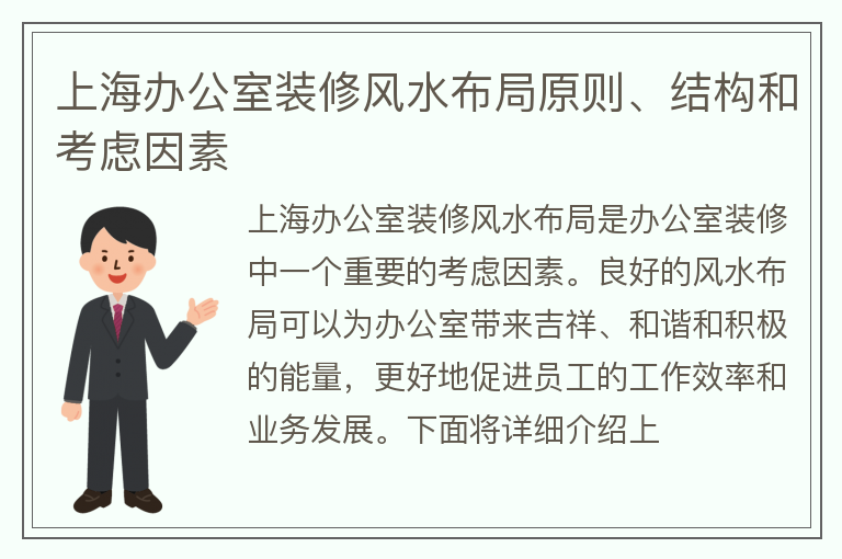上海办公室装修风水布局是办公室装修中一个重要的考虑因素。良好的风水布局可以为办公室带来吉祥、和谐和积极的能量,更好地促进员工的工作效率和业务发展。下面将详细介绍上......【点击详情】