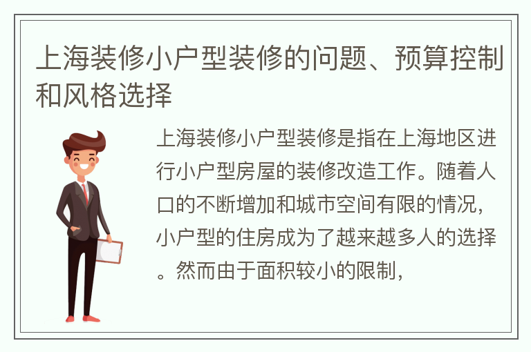 上海装修小户型装修是指在上海地区进行小户型房屋的装修改造工作。随着人口的不断增加和城市空间有限的情况,小户型的住房成为了越来越多人的选择。然而由于面积较小的限制,......【点击详情】