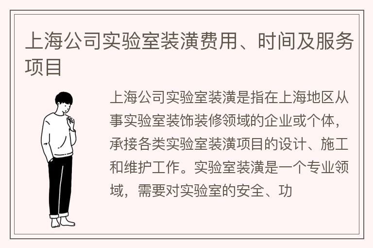 上海公司实验室装潢是指在上海地区从事实验室装饰装修领域的企业或个体,承接各类实验室装潢项目的设计、施工和维护工作。实验室装潢是一个专业领域,需要对实验室的安全、功......【点击详情】