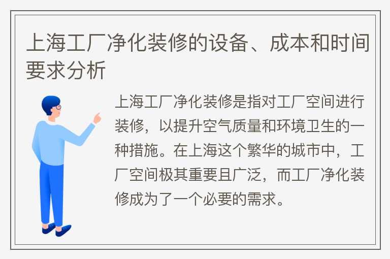 上海工厂净化装修是指对工厂空间进行装修,以提升空气质量和环境卫生的一种措施。在上海这个繁华的城市中,工厂空间极其重要且广泛,而工厂净化装修成为了一个必要的需求。......【点击详情】
