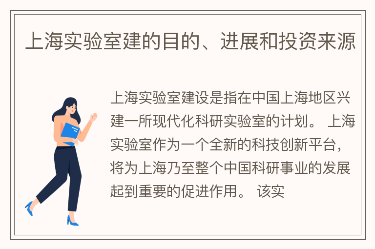 上海实验室建设是指在中国上海地区兴建一所现代化科研实验室的计划。 上海实验室作为一个全新的科技创新平台,将为上海乃至整个中国科研事业的发展起到重要的促进作用。 该实......【点击详情】