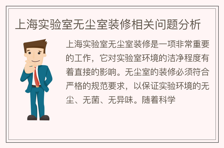 上海实验室无尘室装修是一项非常重要的工作,它对实验室环境的洁净程度有着直接的影响。无尘室的装修必须符合严格的规范要求,以保证实验环境的无尘、无菌、无异味。随着科学......【点击详情】