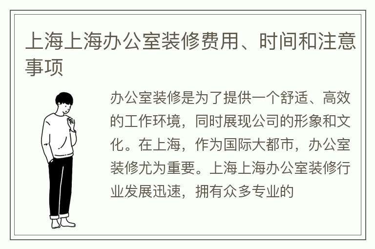 办公室装修是为了提供一个舒适、高效的工作环境,同时展现公司的形象和文化。在上海,作为国际大都市,办公室装修尤为重要。上海上海办公室装修行业发展迅速,拥有众多专业的......【点击详情】