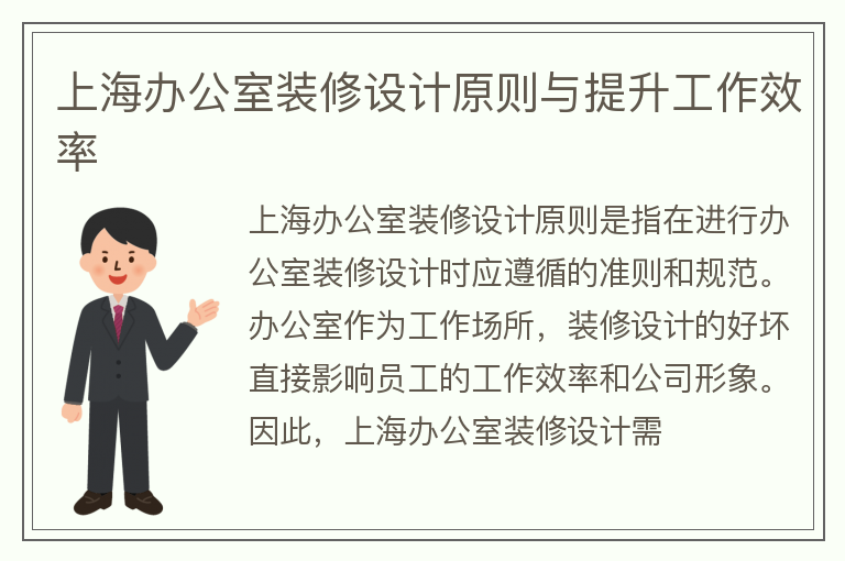 上海办公室装修设计原则是指在进行办公室装修设计时应遵循的准则和规范。办公室作为工作场所,装修设计的好坏直接影响员工的工作效率和公司形象。因此,上海办公室装修设计需......【点击详情】