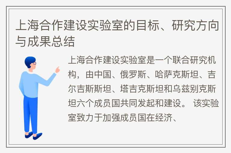 上海合作建设实验室是一个联合研究机构,由中国、俄罗斯、哈萨克斯坦、吉尔吉斯斯坦、塔吉克斯坦和乌兹别克斯坦六个成员国共同发起和建设。 该实验室致力于加强成员国在经济、......【点击详情】