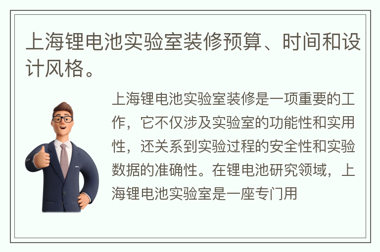 上海锂电池实验室装修是一项重要的工作,它不仅涉及实验室的功能性和实用性,还关系到实验过程的安全性和实验数据的准确性。在锂电池研究领域,上海锂电池实验室是一座专门用......【点击详情】