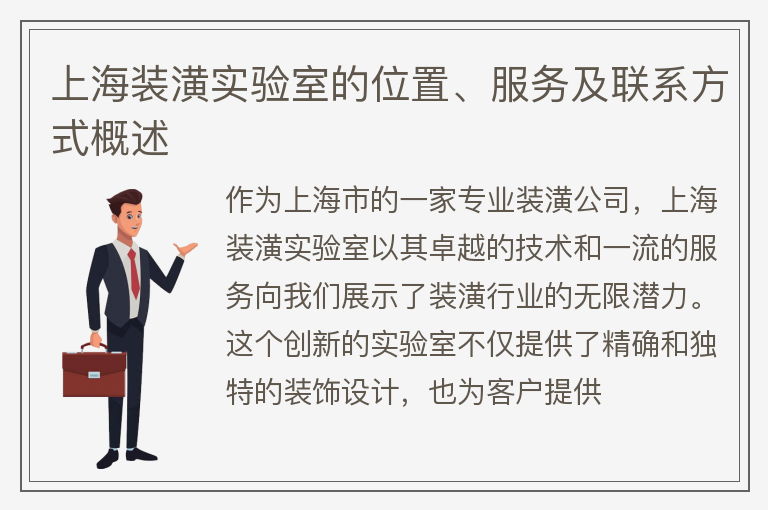 作为上海市的一家专业装潢公司,上海装潢实验室以其卓越的技术和一流的服务向我们展示了装潢行业的无限潜力。这个创新的实验室不仅提供了精确和独特的装饰设计,也为客户提供......【点击详情】