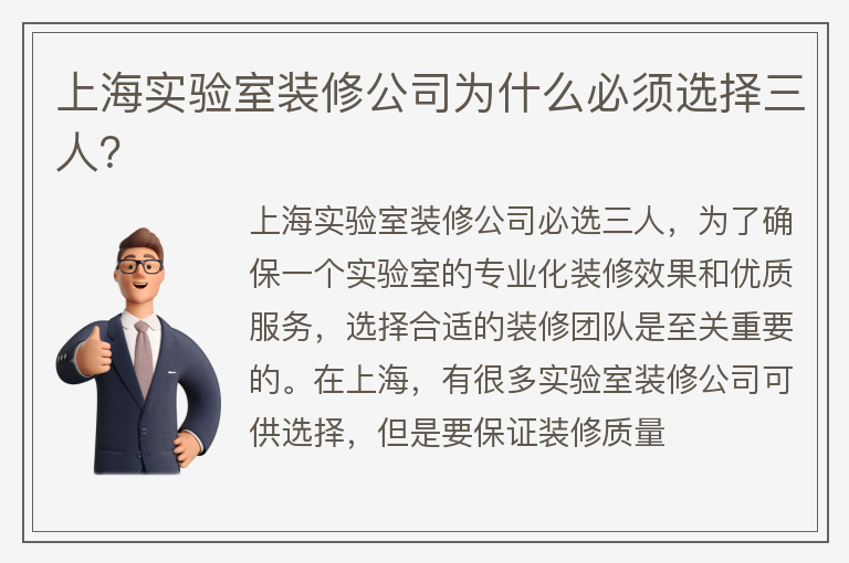 上海实验室装修公司必选三人,为了确保一个实验室的专业化装修效果和优质服务,选择合适的装修团队是至关重要的。在上海,有很多实验室装修公司可供选择,但是要保证装修质量......【点击详情】