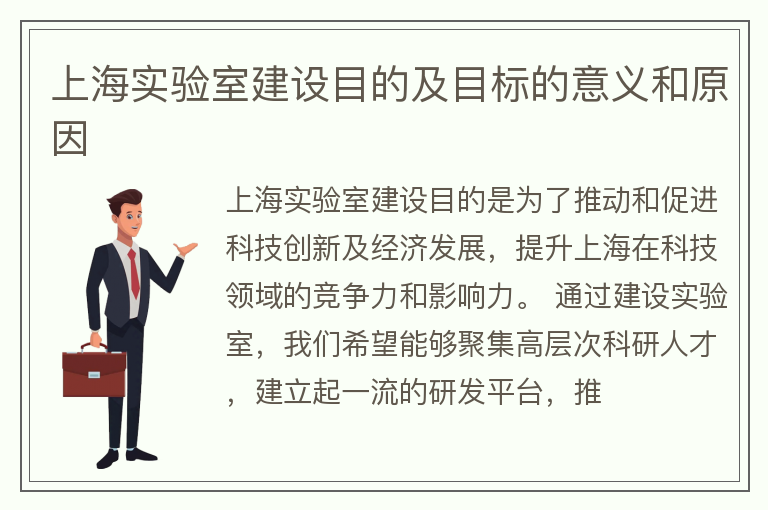 上海实验室建设目的是为了推动和促进科技创新及经济发展,提升上海在科技领域的竞争力和影响力。 通过建设实验室,我们希望能够聚集高层次科研人才,建立起一流的研发平台,推......【点击详情】