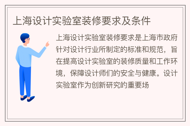 上海设计实验室装修要求是上海市政府针对设计行业所制定的标准和规范,旨在提高设计实验室的装修质量和工作环境,保障设计师们的安全与健康。设计实验室作为创新研究的重要场......【点击详情】