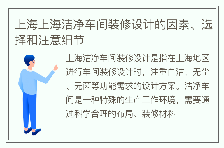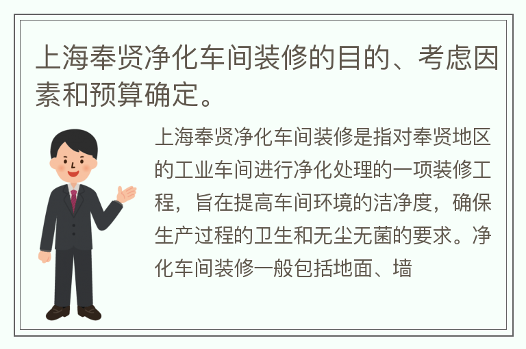 上海奉贤净化车间装修的目的、考虑因素和预算确定。