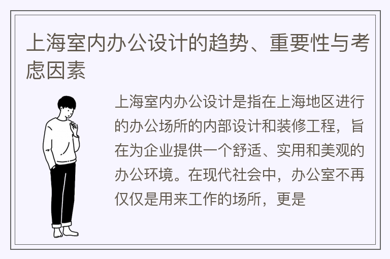 上海室内办公设计是指在上海地区进行的办公场所的内部设计和装修工程,旨在为企业提供一个舒适、实用和美观的办公环境。在现代社会中,办公室不再仅仅是用来工作的场所,更是......【点击详情】