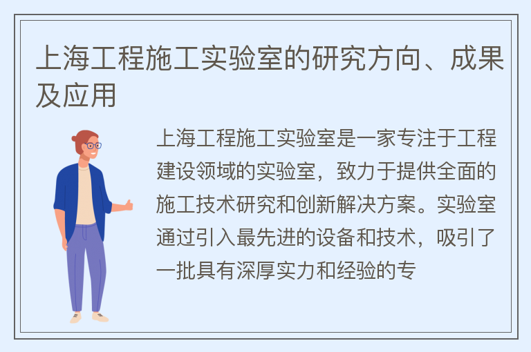 上海工程施工实验室是一家专注于工程建设领域的实验室,致力于提供全面的施工技术研究和创新解决方案。实验室通过引入最先进的设备和技术,吸引了一批具有深厚实力和经验的专......【点击详情】