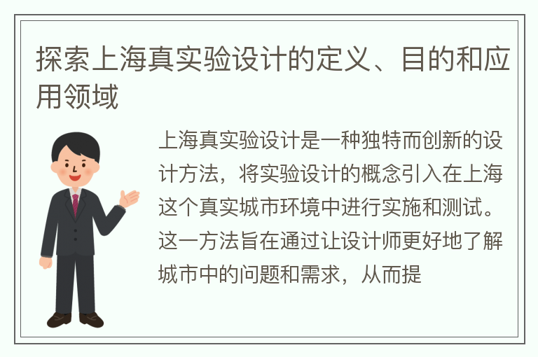 上海真实验设计是一种独特而创新的设计方法,将实验设计的概念引入在上海这个真实城市环境中进行实施和测试。这一方法旨在通过让设计师更好地了解城市中的问题和需求,从而提......【点击详情】