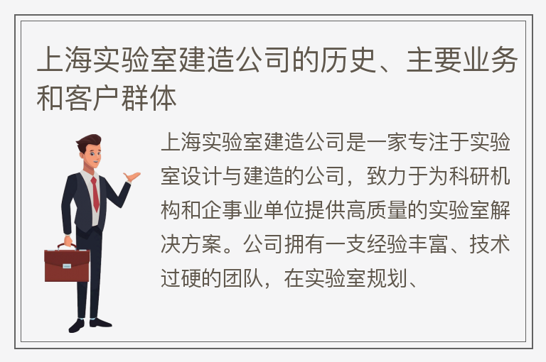 上海实验室建造公司是一家专注于实验室设计与建造的公司,致力于为科研机构和企事业单位提供高质量的实验室解决方案。公司拥有一支经验丰富、技术过硬的团队,在实验室规划、......【点击详情】