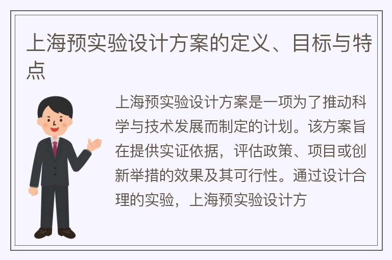 上海预实验设计方案是一项为了推动科学与技术发展而制定的计划。该方案旨在提供实证依据,评估政策、项目或创新举措的效果及其可行性。通过设计合理的实验,上海预实验设计方......【点击详情】