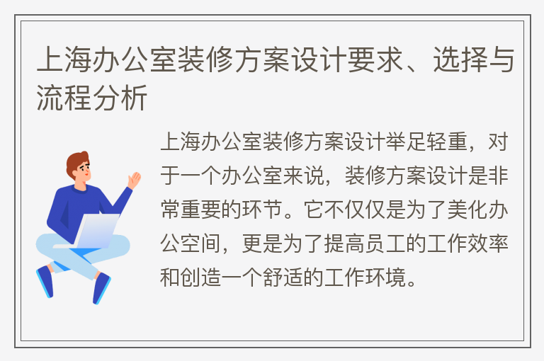 上海办公室装修方案设计举足轻重,对于一个办公室来说,装修方案设计是非常重要的环节。它不仅仅是为了美化办公空间,更是为了提高员工的工作效率和创造一个舒适的工作环境。......【点击详情】