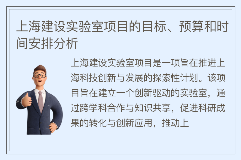 上海建设实验室项目是一项旨在推进上海科技创新与发展的探索性计划。该项目旨在建立一个创新驱动的实验室,通过跨学科合作与知识共享,促进科研成果的转化与创新应用,推动上......【点击详情】