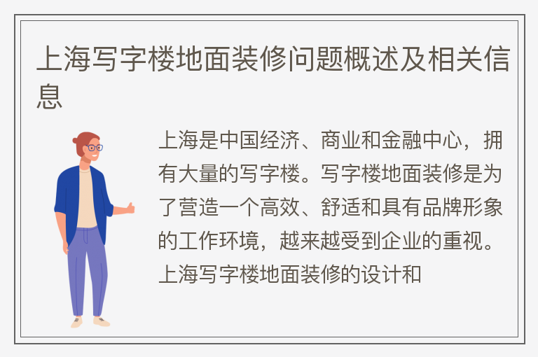 上海是中国经济、商业和金融中心,拥有大量的写字楼。写字楼地面装修是为了营造一个高效、舒适和具有品牌形象的工作环境,越来越受到企业的重视。上海写字楼地面装修的设计和......【点击详情】