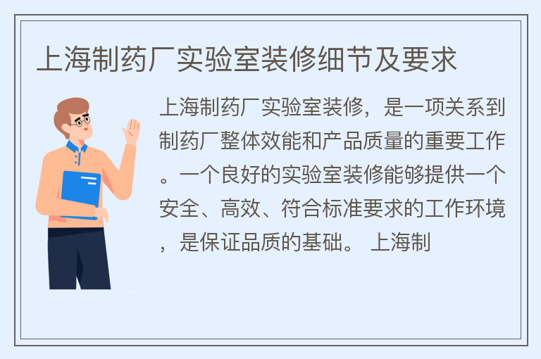 上海制药厂实验室装修,是一项关系到制药厂整体效能和产品质量的重要工作。一个良好的实验室装修能够提供一个安全、高效、符合标准要求的工作环境,是保证品质的基础。 上海制......【点击详情】