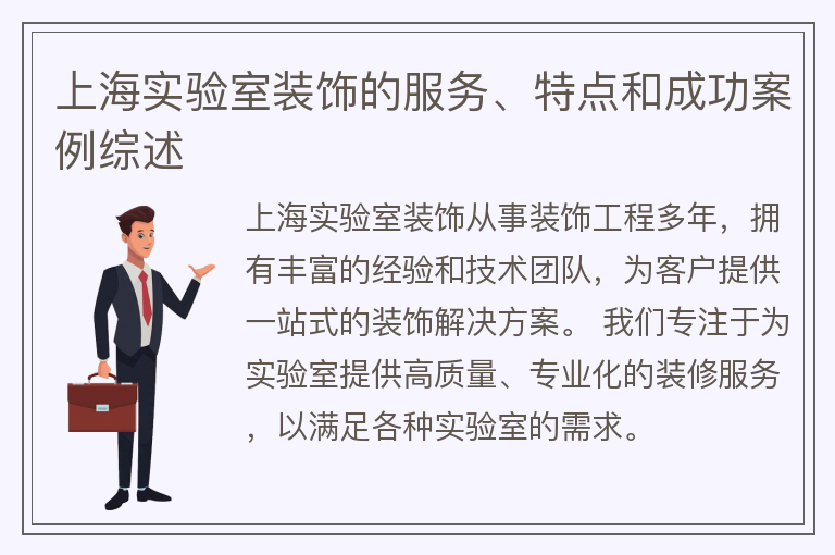 上海实验室装饰从事装饰工程多年,拥有丰富的经验和技术团队,为客户提供一站式的装饰解决方案。 我们专注于为实验室提供高质量、专业化的装修服务,以满足各种实验室的需求。......【点击详情】