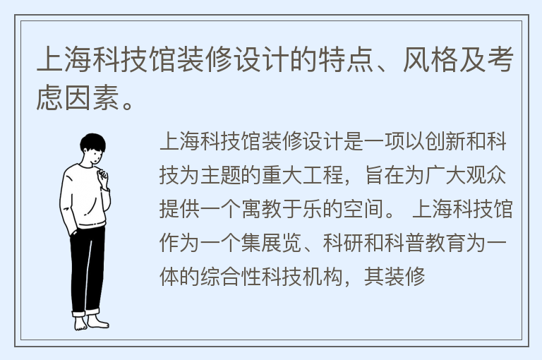 上海科技馆装修设计是一项以创新和科技为主题的重大工程,旨在为广大观众提供一个寓教于乐的空间。 上海科技馆作为一个集展览、科研和科普教育为一体的综合性科技机构,其装修......【点击详情】