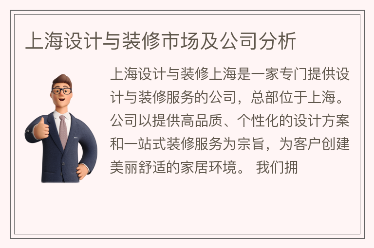 上海设计与装修上海是一家专门提供设计与装修服务的公司,总部位于上海。公司以提供高品质、个性化的设计方案和一站式装修服务为宗旨,为客户创建美丽舒适的家居环境。 我们拥......【点击详情】