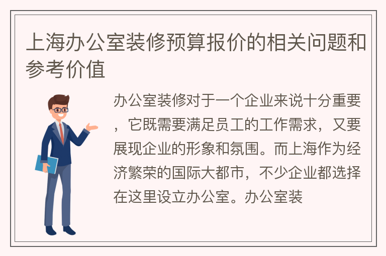 办公室装修对于一个企业来说十分重要,它既需要满足员工的工作需求,又要展现企业的形象和氛围。而上海作为经济繁荣的国际大都市,不少企业都选择在这里设立办公室。办公室装......【点击详情】