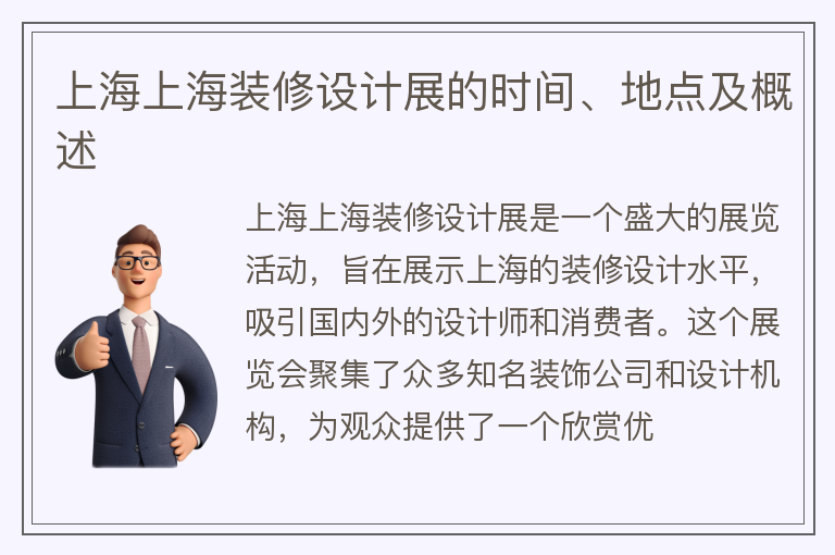 上海上海装修设计展是一个盛大的展览活动,旨在展示上海的装修设计水平,吸引国内外的设计师和消费者。这个展览会聚集了众多知名装饰公司和设计机构,为观众提供了一个欣赏优......【点击详情】