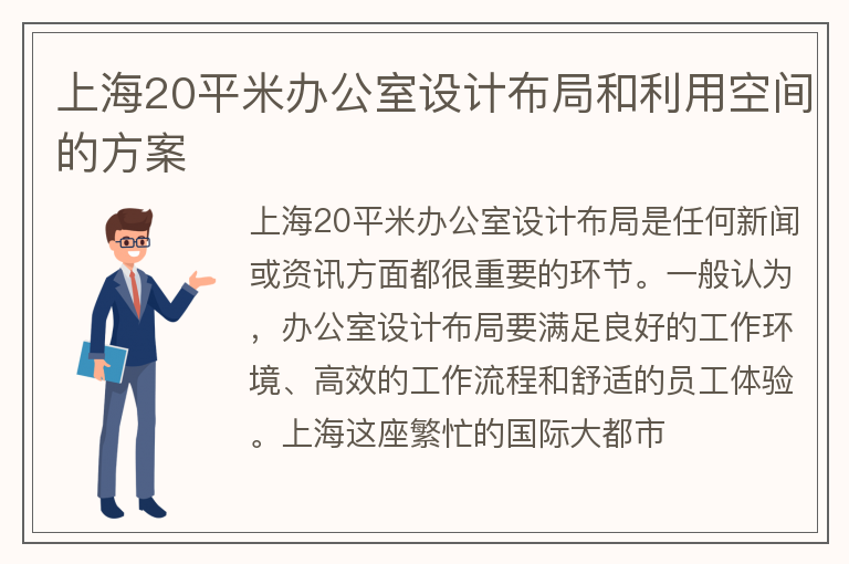 上海20平米办公室设计布局是任何新闻或资讯方面都很重要的环节。一般认为,办公室设计布局要满足良好的工作环境、高效的工作流程和舒适的员工体验。上海这座繁忙的国际大都市......【点击详情】