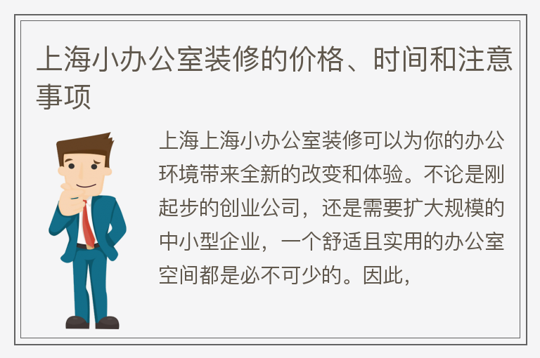 上海上海小办公室装修可以为你的办公环境带来全新的改变和体验。不论是刚起步的创业公司,还是需要扩大规模的中小型企业,一个舒适且实用的办公室空间都是必不可少的。因此,......【点击详情】