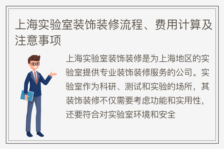 上海实验室装饰装修是为上海地区的实验室提供专业装饰装修服务的公司。实验室作为科研、测试和实验的场所,其装饰装修不仅需要考虑功能和实用性,还要符合对实验室环境和安全......【点击详情】