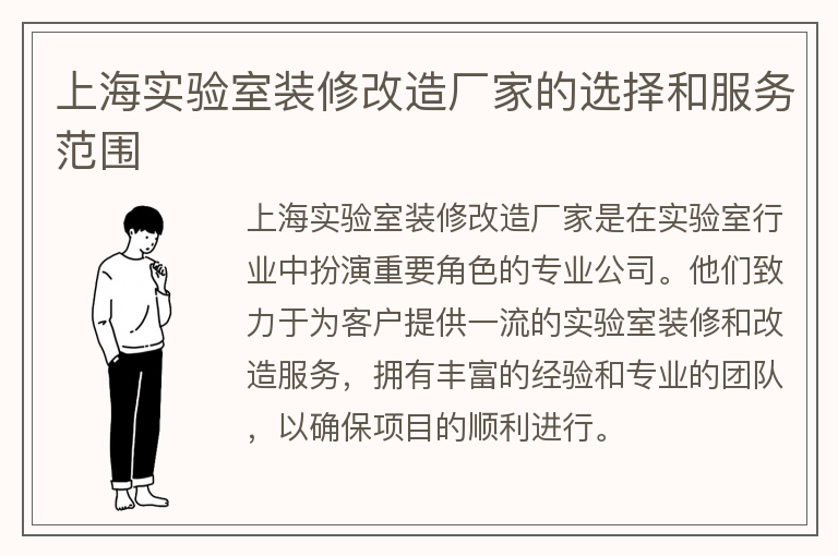 上海实验室装修改造厂家是在实验室行业中扮演重要角色的专业公司。他们致力于为客户提供一流的实验室装修和改造服务,拥有丰富的经验和专业的团队,以确保项目的顺利进行。......【点击详情】