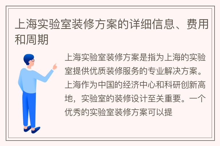 上海实验室装修方案是指为上海的实验室提供优质装修服务的专业解决方案。上海作为中国的经济中心和科研创新高地,实验室的装修设计至关重要。一个优秀的实验室装修方案可以提......【点击详情】