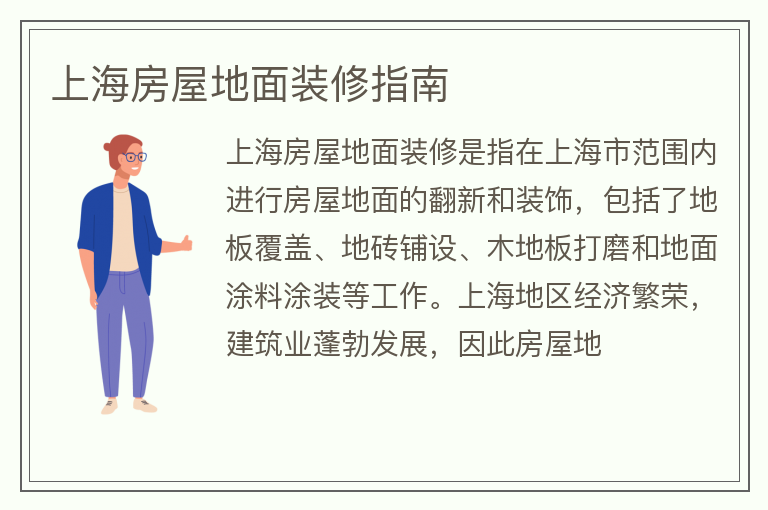 上海房屋地面装修是指在上海市范围内进行房屋地面的翻新和装饰,包括了地板覆盖、地砖铺设、木地板打磨和地面涂料涂装等工作。上海地区经济繁荣,建筑业蓬勃发展,因此房屋地......【点击详情】