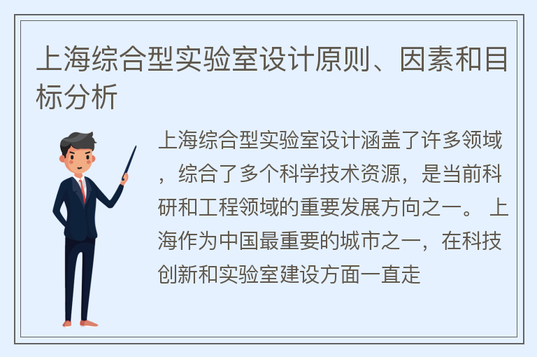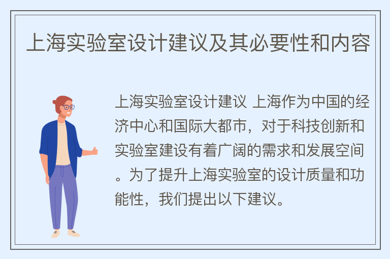 上海实验室设计建议 上海作为中国的经济中心和国际大都市,对于科技创新和实验室建设有着广阔的需求和发展空间。为了提升上海实验室的设计质量和功能性,我们提出以下建议。......【点击详情】