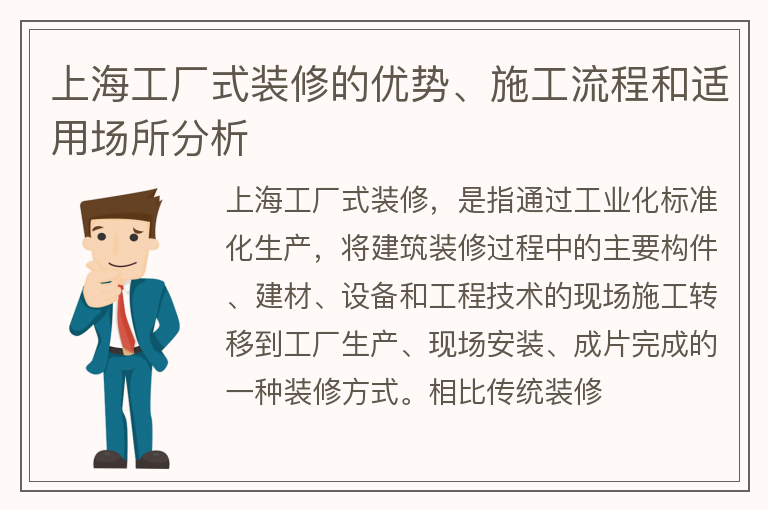 上海工厂式装修,是指通过工业化标准化生产,将建筑装修过程中的主要构件、建材、设备和工程技术的现场施工转移到工厂生产、现场安装、成片完成的一种装修方式。相比传统装修......【点击详情】