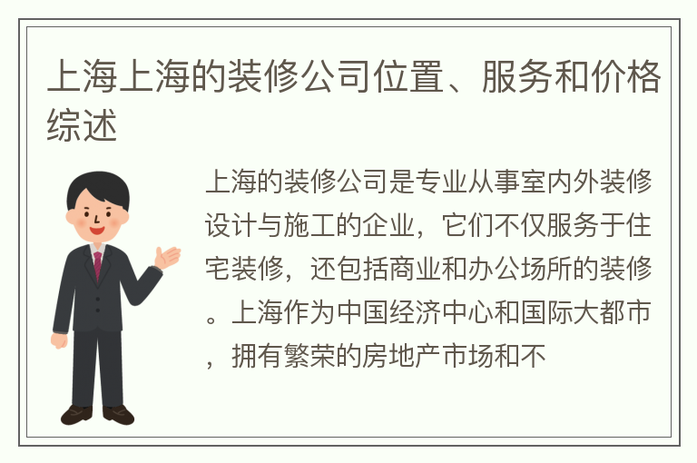 上海的装修公司是专业从事室内外装修设计与施工的企业,它们不仅服务于住宅装修,还包括商业和办公场所的装修。上海作为中国经济中心和国际大都市,拥有繁荣的房地产市场和不......【点击详情】