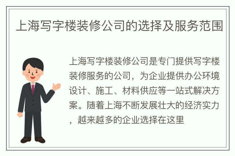 上海写字楼装修公司是专门提供写字楼装修服务的公司,为企业提供办公环境设计、施工、材料供应等一站式解决方案。随着上海不断发展壮大的经济实力,越来越多的企业选择在这里......【点击详情】