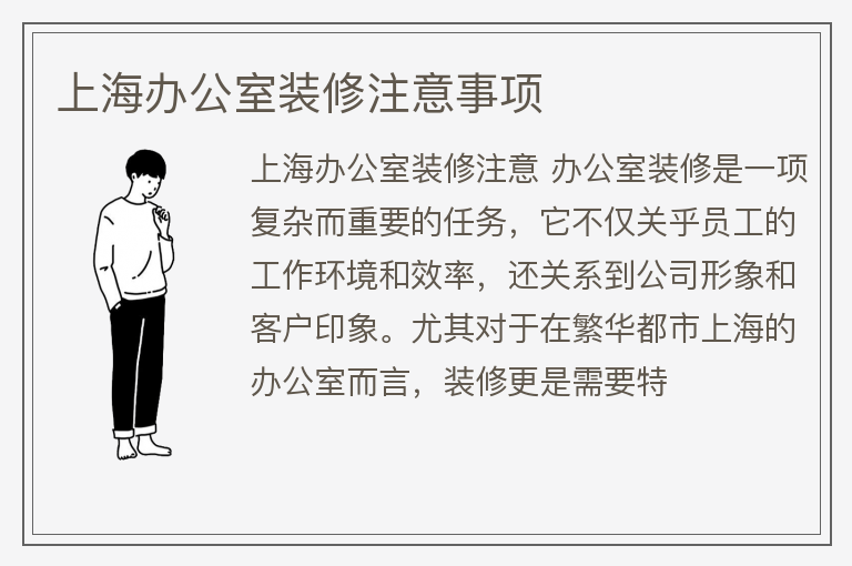 上海办公室装修注意 办公室装修是一项复杂而重要的任务,它不仅关乎员工的工作环境和效率,还关系到公司形象和客户印象。尤其对于在繁华都市上海的办公室而言,装修更是需要特......【点击详情】