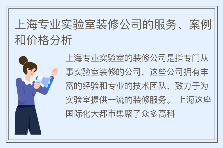 上海专业实验室的装修公司是指专门从事实验室装修的公司,这些公司拥有丰富的经验和专业的技术团队,致力于为实验室提供一流的装修服务。 上海这座国际化大都市集聚了众多高科......【点击详情】