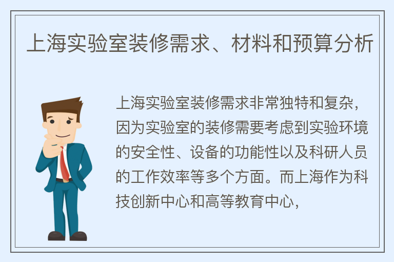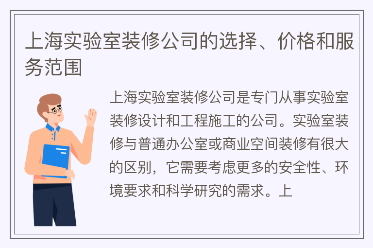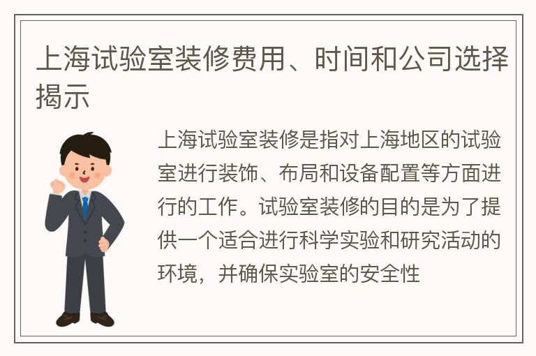上海试验室装修是指对上海地区的试验室进行装饰、布局和设备配置等方面进行的工作。试验室装修的目的是为了提供一个适合进行科学实验和研究活动的环境,并确保实验室的安全性......【点击详情】