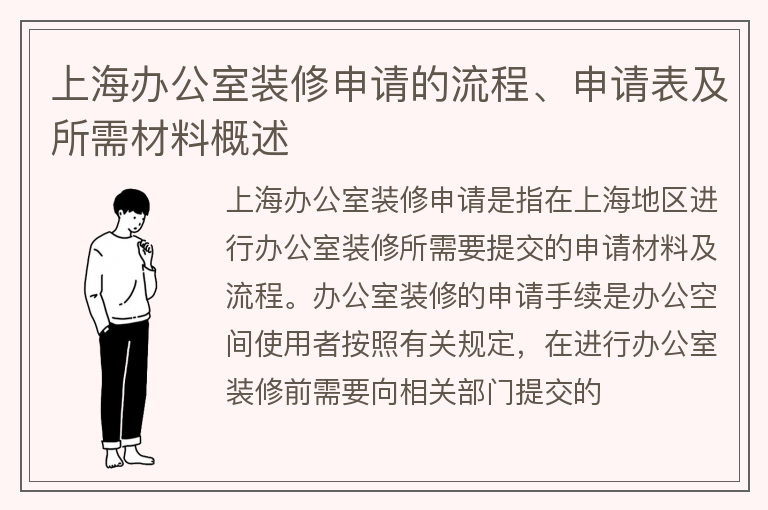 上海办公室装修申请是指在上海地区进行办公室装修所需要提交的申请材料及流程。办公室装修的申请手续是办公空间使用者按照有关规定,在进行办公室装修前需要向相关部门提交的......【点击详情】