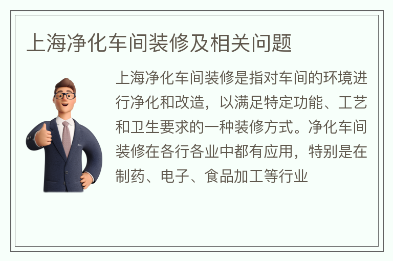 上海净化车间装修是指对车间的环境进行净化和改造,以满足特定功能、工艺和卫生要求的一种装修方式。净化车间装修在各行各业中都有应用,特别是在制药、电子、食品加工等行业......【点击详情】
