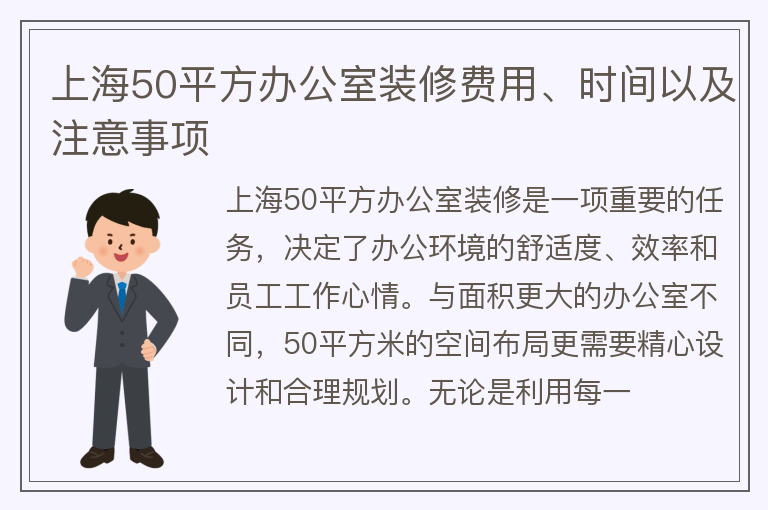 上海50平方办公室装修是一项重要的任务,决定了办公环境的舒适度、效率和员工工作心情。与面积更大的办公室不同,50平方米的空间布局更需要精心设计和合理规划。无论是利用每一......【点击详情】