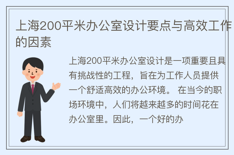 上海200平米办公室设计是一项重要且具有挑战性的工程,旨在为工作人员提供一个舒适高效的办公环境。 在当今的职场环境中,人们将越来越多的时间花在办公室里。因此,一个好的办......【点击详情】